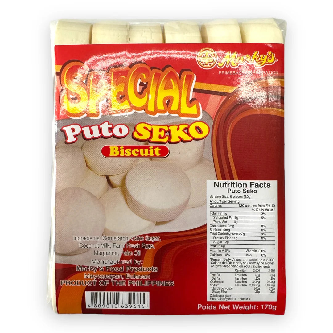 Marky's Special Puto Seko Biscuit is traditional Filipino biscuit known for its unique texture and flavor. Unlike other types of cookies or biscuits, puto seko has a distinctive crumbly and somewhat dry texture. It's made from rice flour, which gives it a different taste and consistency compared to wheat flour-based biscuits.