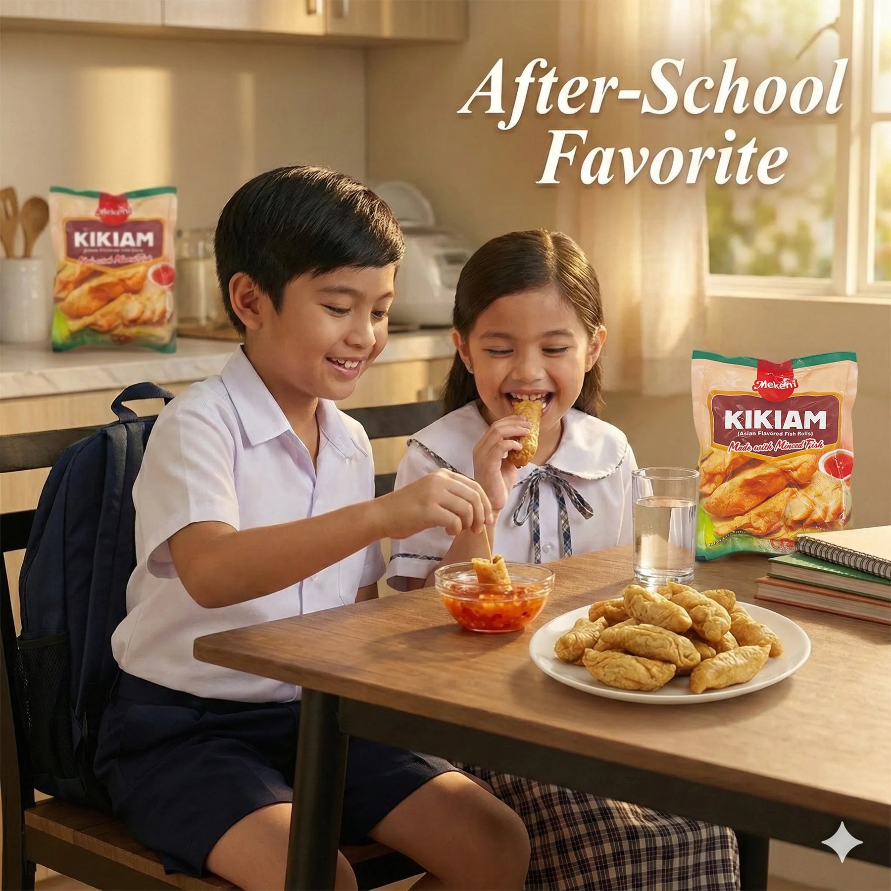 Mekeni Kikiam brings the beloved taste of Filipino street food straight to your kitchen. These savory fish rolls are made from a delicious blend of minced fish, squid, onions, and aromatic spices with a hint of sweetness that makes them truly addicting. Deep-fry them until golden and crispy on the outside while staying tender and chewy inside - just like the kikiam from street vendors that kabayan remembers fondly.